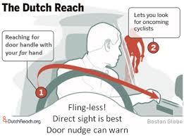 “…it works like this: When you are about to exit the car, you reach across your body for the door handle with your far or opposite hand. This action forces you to turn toward the side view mirror, out and then back over your shoulder to be sure a bicyclist is not coming from behind. Only then do you slowly open the door.”