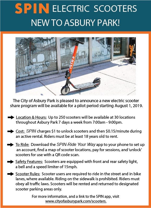 The Zagster bike share company operating in Asbury Park has teamed up with Spin Scooters. Scooters are coming on Thursday, 8/1/2019! Sign up here.
